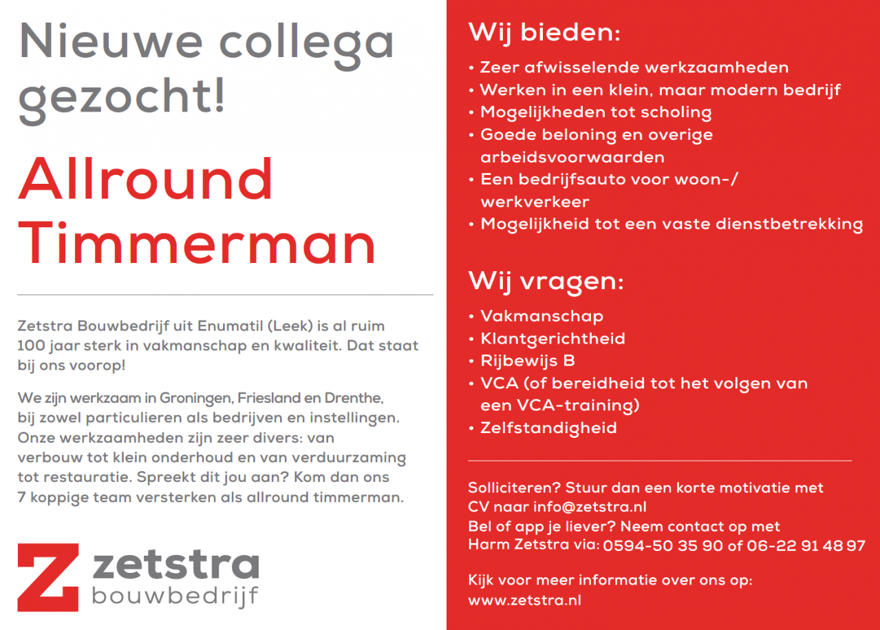 Vacature: Timmerman bij Zetstra Bouwbedrijf Enumatil B.V.
